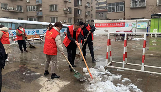 昨晚,鄭州市迎來了牛年第一場(chǎng)雪,小區(qū)活動(dòng)場(chǎng)地已披上一層皚皚白雪,為方便小區(qū)居民通行,志愿者們拿著鐵鍬、掃把清理廣場(chǎng)上的積雪,經(jīng)過大家的努力,積雪被清理干凈。