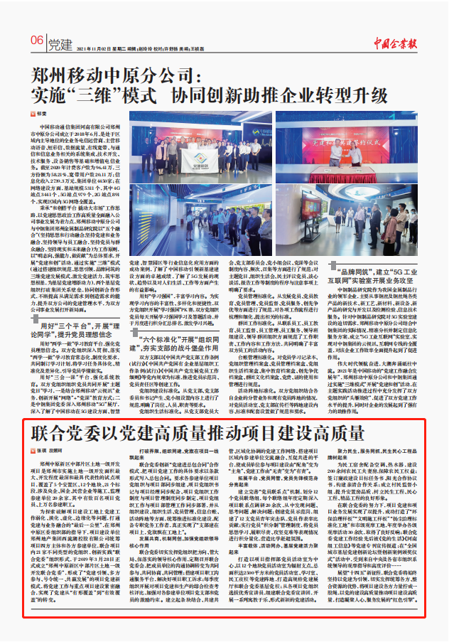 西流湖公司始終堅(jiān)持“抓好黨建就是最大的政績”,創(chuàng)新“黨建進(jìn)總包合同”合作模式,貫徹落實(shí)“支部建在項(xiàng)目上,黨旗飄在工地上”的工作思路,以中原新區(qū)中部片區(qū)土地一級開發(fā)聯(lián)合黨委和項(xiàng)目黨支部建設(shè)為抓手,以“12343”黨建工作體系為指引,讓黨的主張、黨的作風(fēng)、黨組織的力量在項(xiàng)目建設(shè)中處處彰顯,充分激發(fā)黨員的先鋒模范作用和黨組織的堅(jiān)強(qiáng)堡壘作用,將黨建轉(zhuǎn)化為生產(chǎn)力,真正實(shí)現(xiàn)黨建促發(fā)展的“紅色引擎”作用。公司黨建工作先進(jìn)經(jīng)驗(yàn)榮登《中國企業(yè)報(bào)》,意味著公司黨建工作先進(jìn)經(jīng)驗(yàn)對于全國企業(yè)黨建具有良好的借鑒意義,標(biāo)志著公司黨建工作及宣傳水平再上新臺(tái)階。