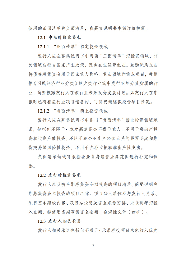 (二)申報(bào)材料應(yīng)明確債券募集資金禁止投向領(lǐng)域,形成“負(fù)面清單”。“負(fù)面清單”包括但不限于:將募集資金借予他人,用于房地產(chǎn)投資和過(guò)剩產(chǎn)能投資,用于與企業(yè)生產(chǎn)經(jīng)營(yíng)無(wú)關(guān)的股票買賣和期貨交易等風(fēng)險(xiǎn)性投資,用于彌補(bǔ)虧損和非生產(chǎn)性支出。“負(fù)面清單”領(lǐng)域可根據(jù)企業(yè)自身經(jīng)營(yíng)業(yè)務(wù)范圍進(jìn)行補(bǔ)充和調(diào)整。
